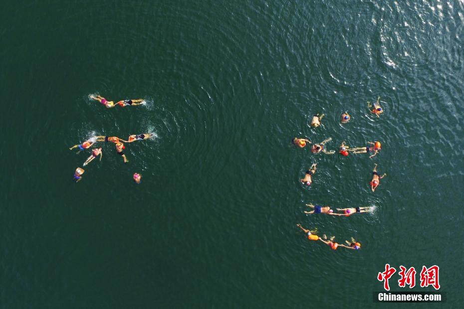 中老年冬泳爱好者们多次尝试在冰冷的水中摆出“元旦”二字皆失败。杨华峰 摄