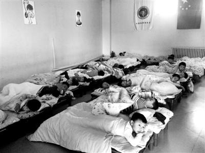 北青报记者来到赛尔维斯教育中心时正值午饭时间,孩子们吃完午饭正准备午睡,这间屋子窗户开在较高的地方,小床一个挨一个,一间教室大小的屋子里睡了20几个孩子。据记者观察,这里共设置四个教学班,与普通小学教室基本一样,没有发现幼儿园应具备的大型活动器械和游戏玩具等。
