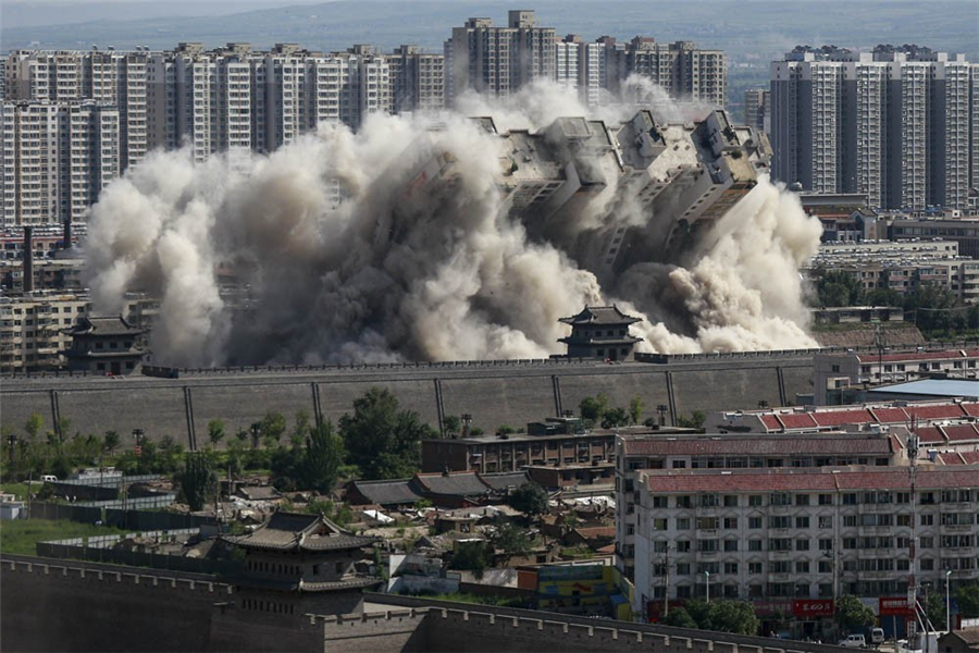 2016年8月8日,山西大同,古城墙旁的一栋90米高大楼被爆破拆除。