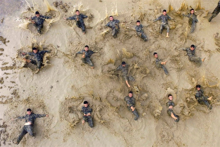2016年9月18日,广西百色,武警广西总队南宁市支队组织特战分队的战士在泥塘中进行搏击训练。