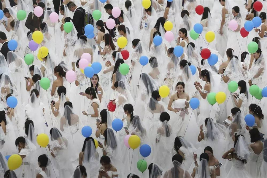 2016年10月7日,江苏苏州,908位身着婚纱的女子创造了一项“最多人装扮新娘聚会”吉尼斯世界纪录。