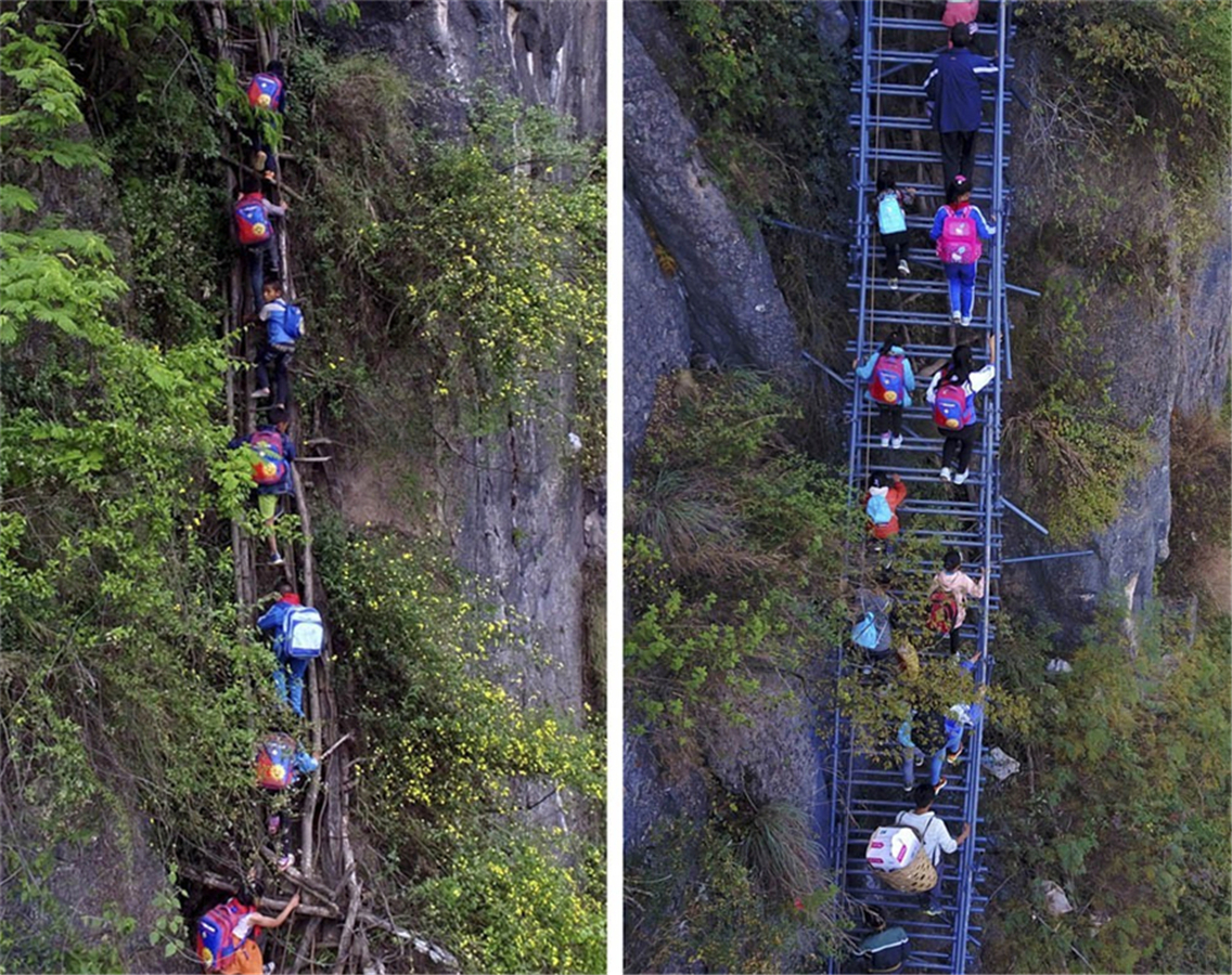 2016年11月19日,四川凉山,在有“悬崖村”之称的阿土勒尔村,学生们攀爬新修好的钢梯回家(右),相比6个月前攀爬简易藤梯(左),不仅安全性大大提升,还缩短约一个小时。