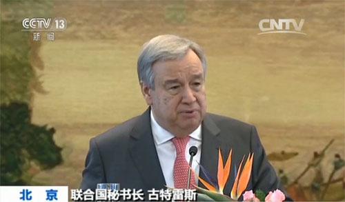 联合国秘书长古特雷斯说,中国创造性地提出了很多让世界可以可持续发展的举措,比如说建立新的基金,新的国际性银行,提出了新的国际合作模式,比如“一带一路”倡议。