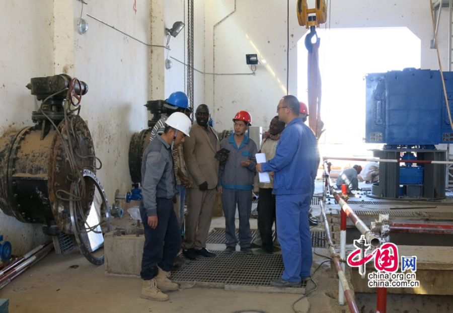 中苏双方技术人员在位于苏丹北方州的马塔革泵站提质改造施工现场。