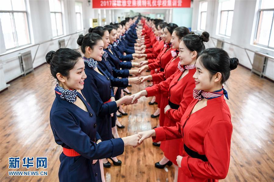 1月4日,欧雅空乘模特礼仪学校空乘专业的考生们正在进行握手练习。新华社记者 李博 摄 图片来源:新华网