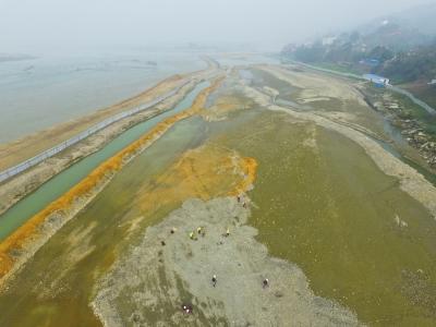 1个月前,围挡搭好后,10台高功率抽水机同时启动,2000多平方米区域内的水终于抽干了,露出一颗颗鹅卵石,形成了一个“江中小岛”。