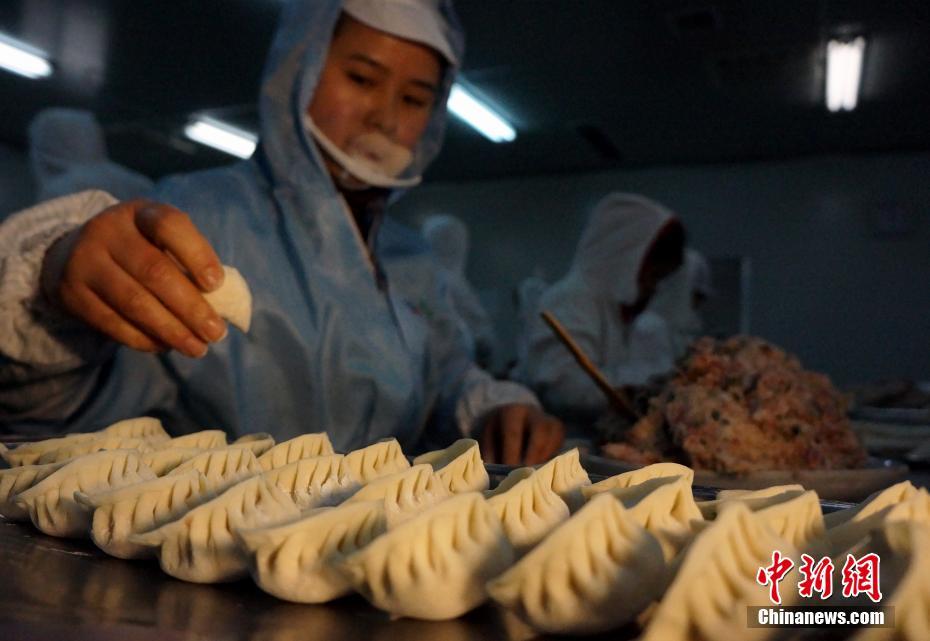不到5秒时间,拣皮、挑馅、掐花,一气呵成,一只个头饱满的饺子就呈现在眼前。1月8日,在江西省万载县高城镇一家专业生产手工饺子的食品厂内,数十位女工正忙碌着生产。工厂负责人辛增平告诉记者,工厂每月生产手工饺子约20万斤,女工们每天工作十小时,每人每天手工包出4000只饺子。图为潘桂梅正在制作手工饺子。最快的速度是每4秒包出一只完整的饺子,每天可以包出130斤,约4000只。王昊阳摄
