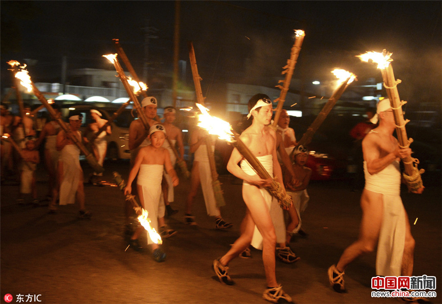 当地时间2017年1月7日,日本福冈县久留米,男人们穿着缠腰带,打着灯笼在大善寺玉垂宫参加Oniyo火祭节。这是一个大约有1600年历史的传统,可以为当地居民驱魔招福。Toshiro Kubo/东方IC