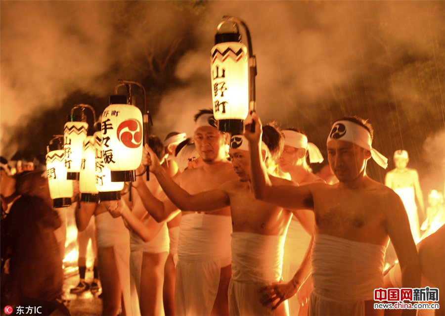 当地时间2017年1月7日,日本福冈县久留米,男人们穿着缠腰带,打着灯笼在大善寺玉垂宫参加Oniyo火祭节。这是一个大约有1600年历史的传统,可以为当地居民驱魔招福。Toshiro Kubo/东方IC