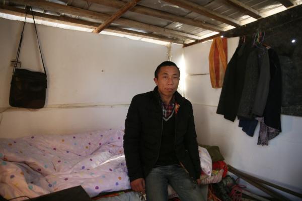 41岁的工人石纪斌在四处透风的工棚内住着,希望今年不要空手回家。澎湃新闻记者 谢匡时 图