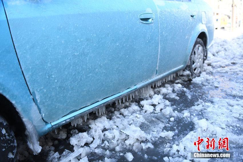 长春管道爆裂结冰 路边车变成“大冰雕”