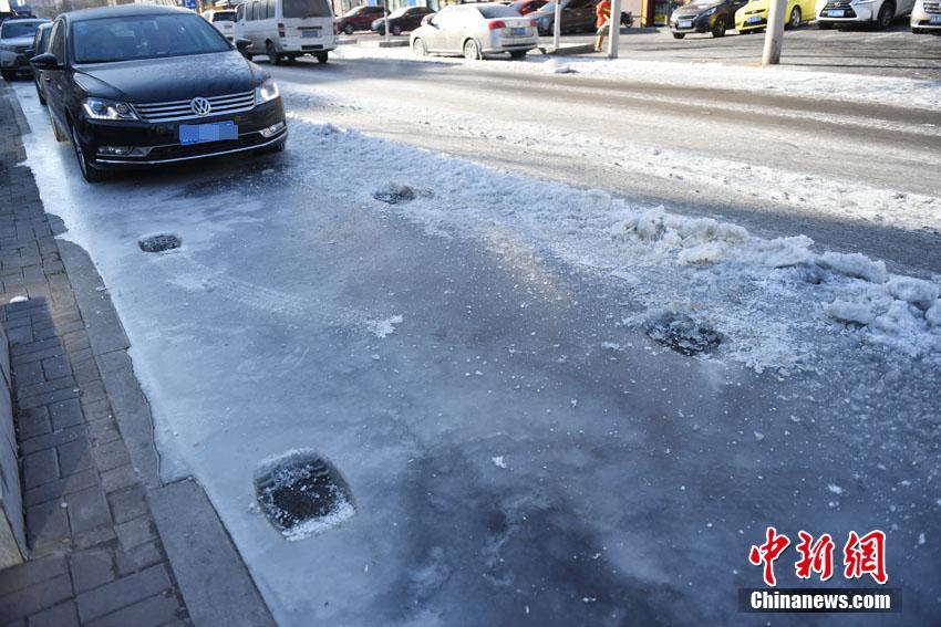 1月10日,在长春市和顺街上,一管道爆裂,喷出大量的水,导致停靠在路边的车辆的车身、轮胎被冻住,无法行驶,宛如一个个“大冰雕”。张瑶 摄