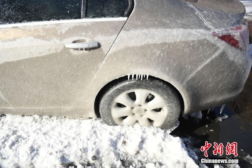 长春管道爆裂结冰 路边车变成“大冰雕”