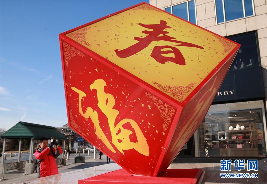 1月10日,一名市民在北京王府井东方新天地广场拍摄福字景观造型。春节日渐临近,北京街头张灯结彩,洋溢着浓浓的节日气氛。新华社发(陈晓根 摄)