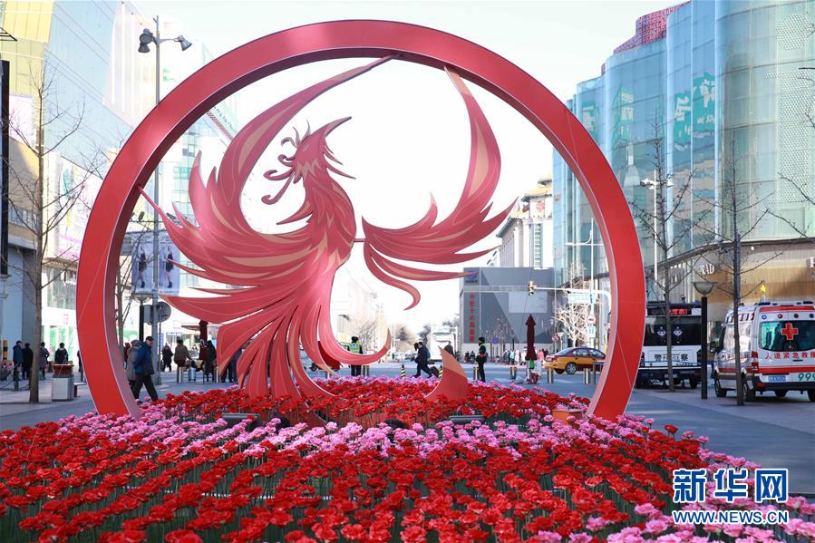 1月10日在北京王府井步行街拍摄的节庆景观造型。春节日渐临近,北京街头张灯结彩,洋溢着浓浓的节日气氛。 新华社发(陈晓根 摄)