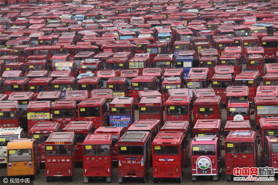 近日,江西省宜春市开展非法载客厢式电动三(四)轮车取缔工作,通过政府收购的方式已取缔934辆。从1月10日起城区规定区域内禁止非法载客厢式电动三(四)轮车通行、停放及运营,加强道路交通安全管理,规范客运市场秩序,改善交通环境。邹海斌/视觉中国