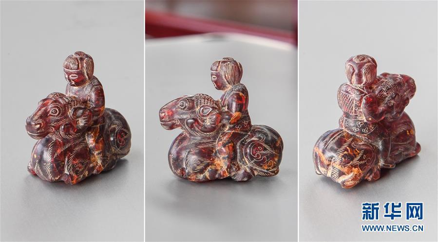 这是河南洛阳市西朱村曹魏大墓出土的琥珀人物骑羊雕刻件(2016年11月8日摄)。新华社记者李贺摄 图片来源:新华网