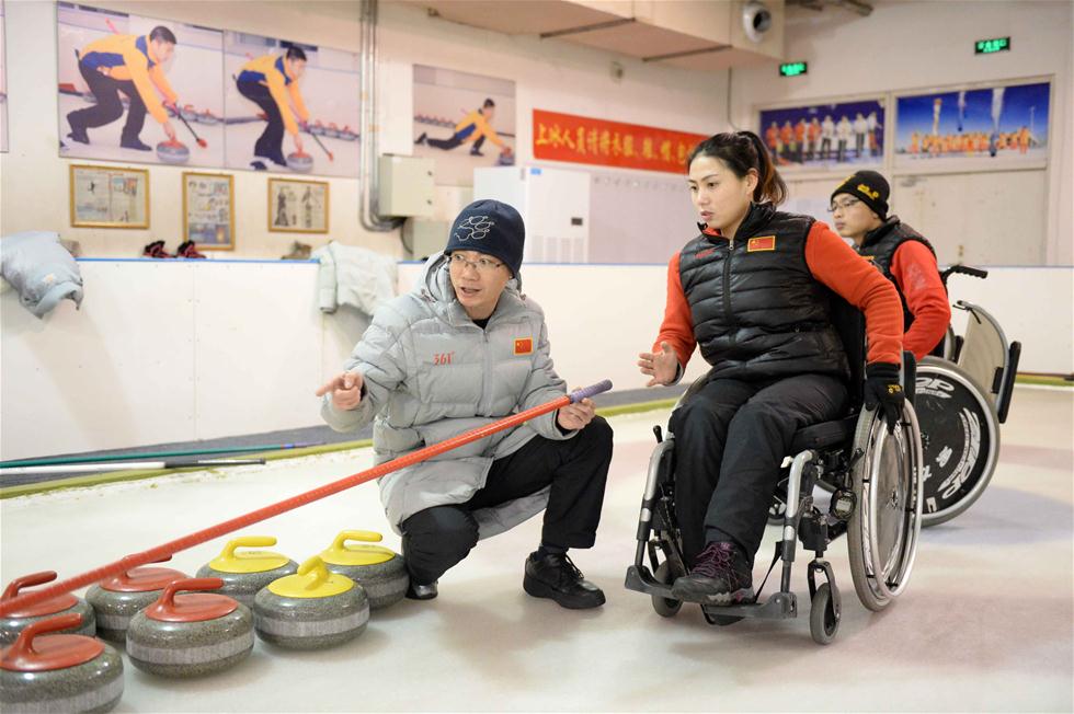 1月11日,中国轮椅冰壶队主教练李建锐(左)正在为队员徐广芹讲解技术要领。为了备战3月份在韩国平昌举行的轮椅冰壶世锦赛,中国轮椅冰壶队正在哈尔滨进行紧张的集训。据中国轮椅冰壶队主教练李建锐介绍,队伍除了例行的中午训练以外,还要在晚上9点至第二天凌晨1点进行加练,“与时间赛跑”成为这支队伍赛前的座右铭。新华社记者王凯摄