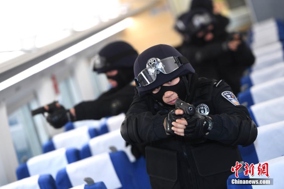 铁警在高铁车厢内进行防暴演练。 陈超 摄