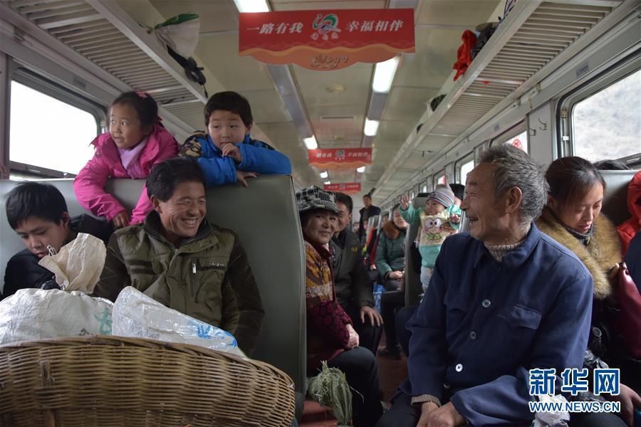 1月11日,村民乘坐8362次列车外出赶集,买回家里所需的年货。当日,近200名山区群众乘坐西安铁路局汉中至阳平关8361/8362次列车外出赶集。8361/8362次列车全程117公里,设有14个站点,最高票价7.5元,最低票价只需1元。这列只有三节车厢的普通绿皮慢车,如今已成为沿线群众出行的首选交通工具,被称为秦巴山区中的“火车大巴”。新华社记者张晨俊 摄 图片来源:新华网