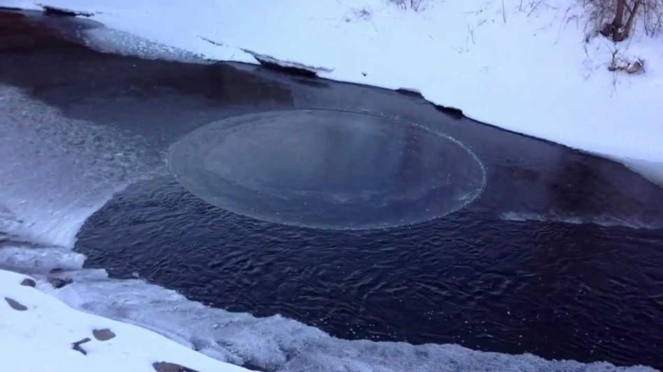 美国一河面现直径16米"旋转大冰盘"