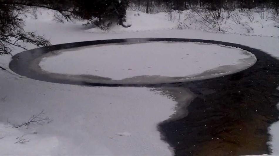 受高压影响,冷空气让冰面结冰,但是河水的温度却没有迅速降下来。于是浮冰便随着漩涡在水里打转。“‘冰盘’不是一个连续的冰面,而是由很多小冰块聚在一起组成的。如果你朝它扔一块石头,石头会穿过‘冰盘’直入水底。”