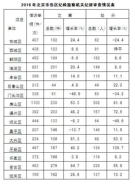 2016年全市给予党政纪处分的2625人中,16个区占1939人,占比73.9%。分区看,处分人数最多的是密云区,达229人;另一个处分人数超过200人的区是房山区,达202人。通州、朝阳、海淀、昌平、平谷、延庆、怀柔、丰台8个区处分人数均超过百人,从157人到110人不等。