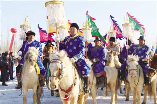 9时30分,在一座直径为40米、高20米的当今世界上最大体量的冰晶敖包下,身穿紫红色僧服的喇嘛开始诵经祈福,祈愿乌拉特草原风调雨顺,各族人民和睦相处。随后,大型民族舞表演、乌拉特民歌演唱震撼全场。10时10分,9名蒙古族骑士骑白色骏马手持苏乐德入场,身着风格独特的民族服装的蒙古马方阵、搏克手方队、哈萨尔弓箭手方队、哈达迎宾方队、民族服饰方队、草原骆驼方队、冬捕队步入会场,冰晶敖包祭祀仪式和冬捕队壮行仪式依次举行。在人们欢呼声中,火炬手骑骏马将从牟纳山主峰采集的火种送进会场,在《牟纳山》的歌舞声中点燃托勒嘎圣火,在场的人们都随着熟悉的音乐唱起歌、跳起舞,整个场地顿成欢乐海洋。内容丰富的开幕式表演点燃了现场观众的激情,人们在冰雪间享受狂欢的乐趣。