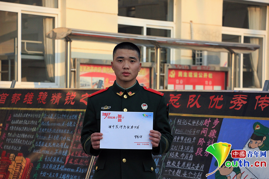 罗彩训是刚到十六支队四中队的新兵。从湖南益阳来到北京,距离家乡一千多公里。1998年出生的罗彩训说自己在从北京西站到新兵连的路上就哭了。“给爸妈打电话,特别想他们。在家的时候没有什么感觉,离开了特别想。”当记者问到他有什么目标时,他说要在部队坚持下去,被中队评为优秀士兵。中国青年网记者开可摄