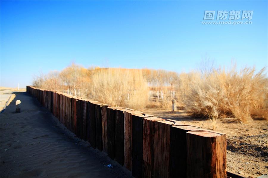 由于风沙较大,点号的官兵用枕木搭起了防风墙,保护着仅存的一片小树林。70公里点号地处沙漠边缘,常年干旱少雨,条件艰苦。在这个胡杨都不能生长的地方,点号的官兵伴随着这条铁路在漫漫风沙中坚守了59年。叶旺明张晓辉 刘辉产 亓创 摄 图片来源:国防部网