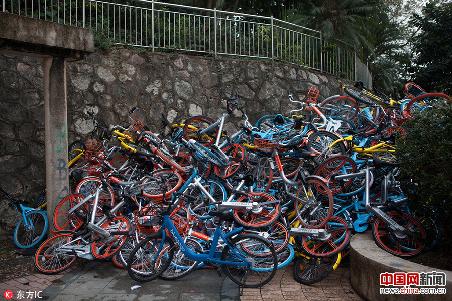2017年1月15日下午,广东深圳,深圳蛇口湾厦山公园旁边出现大面积人为破坏共享单车情况,估计数量超过500辆。现场,包括小蓝、摩拜、小鸣、ofo等在内的几种品牌的数百辆共享单车堆积成两座“小山”,目测有两三米之高。或因外力破坏等原因,不少单车的车把、车篮等零件散落在周围地上,一片狼藉。