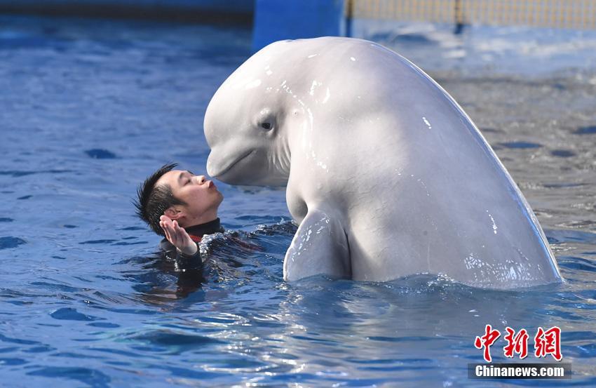 今年24岁的陆海波是一位白鲸饲养员,他每天需要准备白鲸的“餐点”、打扫白鲸的“卧室”、检查它们的健康状况,当然还包括训练白鲸。待游客到来,陆海波则要带着白鲸进行精彩的表演。长期与白鲸的亲密接触,让他与这庞大的海洋动物结上不解之缘。陆海波说,憨萌的白鲸现在是他最心爱的宠物,他想让更多的人了解海洋动物,只有了解才能发自内心的去爱它们。张瑶摄