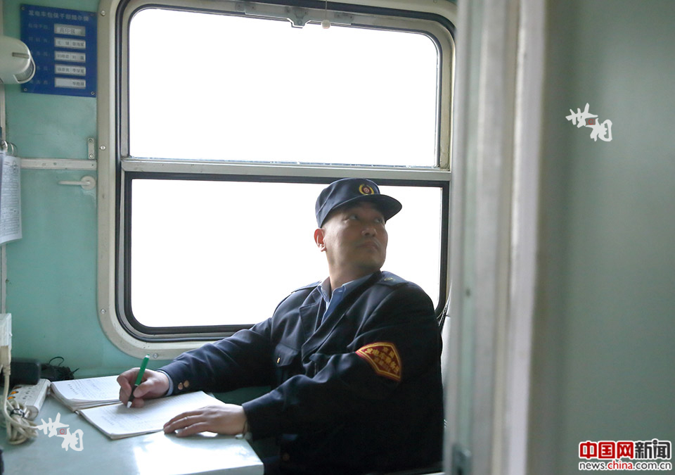 发电车乘务员刘瀛在观察仪表数据并填写检查记录。