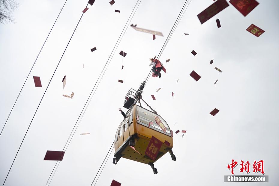 1月19日,湖南平江石牛寨的工作人员装扮成“财神”爬上高空索道,在空中抛撒红包为游客送福,以此迎接即将到来的新春佳节。杨华峰摄