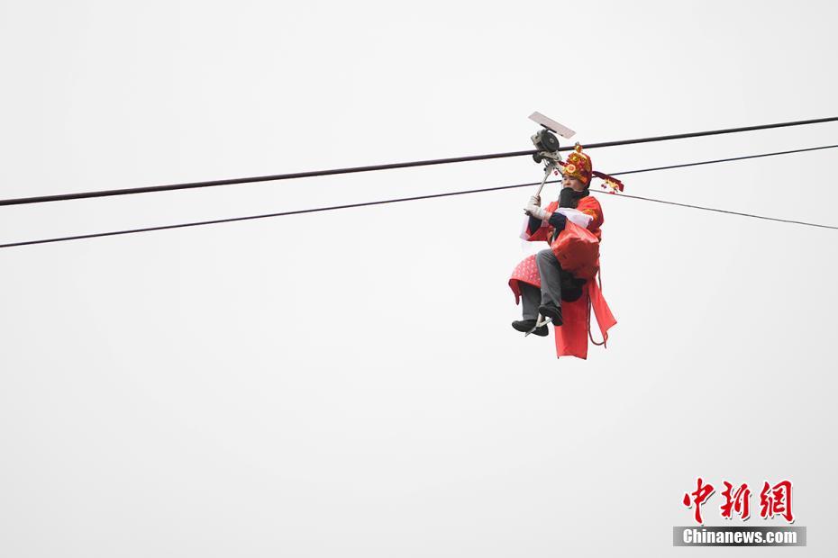 1月19日,湖南平江石牛寨的工作人员装扮成“财神”爬上高空索道,在空中抛撒红包为游客送福,以此迎接即将到来的新春佳节。杨华峰摄