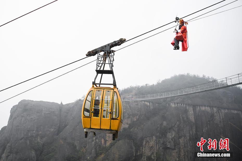 1月19日,湖南平江石牛寨的工作人员装扮成“财神”爬上高空索道,在空中抛撒红包为游客送福,以此迎接即将到来的新春佳节。杨华峰摄