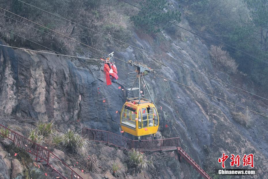 1月19日,湖南平江石牛寨的工作人员装扮成“财神”爬上高空索道,在空中抛撒红包为游客送福,以此迎接即将到来的新春佳节。杨华峰摄