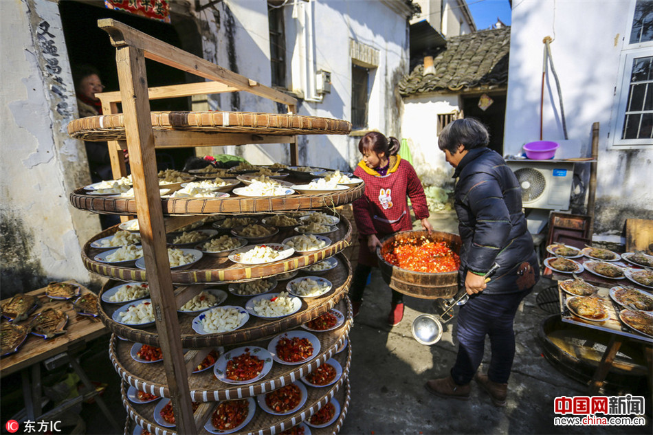 2017年1月21日,安徽青阳县陵阳镇,工作人员精心准备小年陵阳“锅子宴”。(盛文鹏/东方IC)
