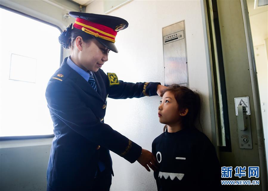 1月21日,在6041次列车上,列车长项兵在给一名小乘客量身高。在内蒙古自治区,集宁至通辽的6041/42次是集通铁路公司管内唯一的一趟烧燃煤锅炉取暖和供水的旅客列车,列车编组8辆,沿途停靠82个车站,单程运行997公里,往返运行46小时。沿途停靠站辐射地带,是国家确定的连片扶贫区域,列车开行20年来一直坚持最惠民的票价,最低票价2.5元。因为该趟列车站站停、票价低,极大方便了沿线农、牧民出行,被沿线农、牧民亲切地称为“便民巴士”。新华社记者连振摄