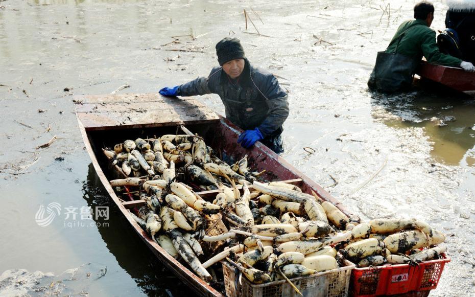 挖藕人的工钱是根据工作量计算的,今年的藕价格不高,才卖到2.5元一斤,这些职业挖藕人每斤能拿到4角5分钱,一天的收入能达到300元以上。(齐鲁网记者白少光 亓子涵 摄)图片来源:齐鲁网