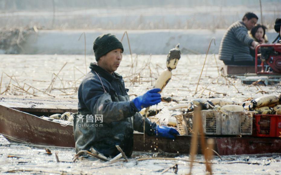 冰湖挖藕人泥里“淘金” 月入过万