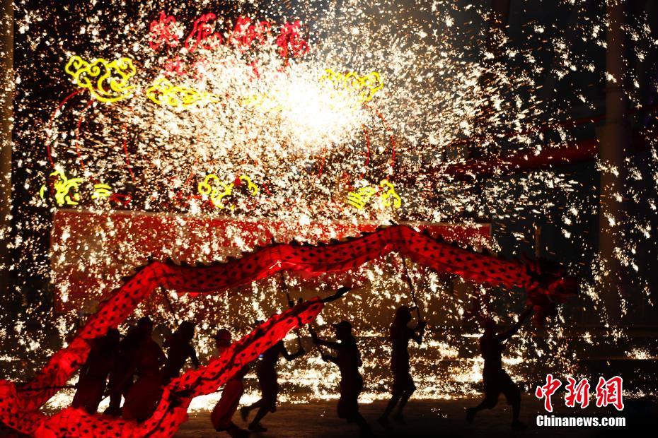 1月29日,重庆铜梁火龙钢花队在北京欢乐谷表演。火龙钢花是国家级非物质文化遗产,源自重庆铜梁,有“中华第一龙”的美誉。高达1500℃的铁水掺杂特制的干花被抛向天空,“铁水流星”瞬间洒向地面,赤膊上阵的舞龙者在“铁水流星”下舞动穿梭。 中新社记者 富田 摄
