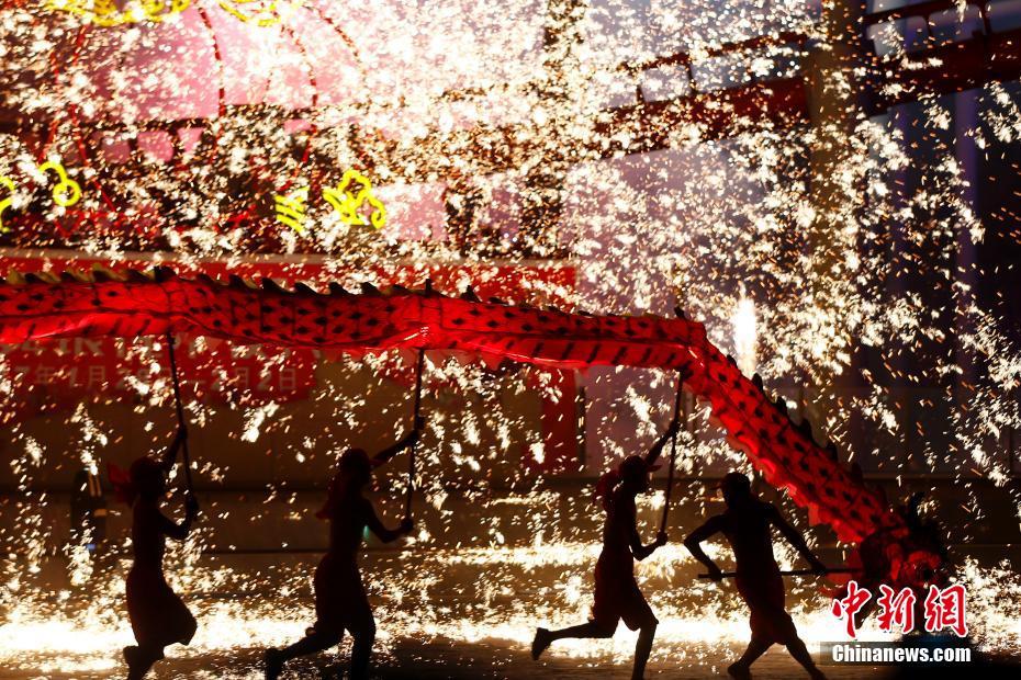 1月29日,重庆铜梁火龙钢花队在北京欢乐谷表演。火龙钢花是国家级非物质文化遗产,源自重庆铜梁,有“中华第一龙”的美誉。高达1500℃的铁水掺杂特制的干花被抛向天空,“铁水流星”瞬间洒向地面,赤膊上阵的舞龙者在“铁水流星”下舞动穿梭。