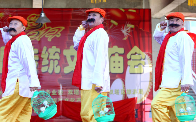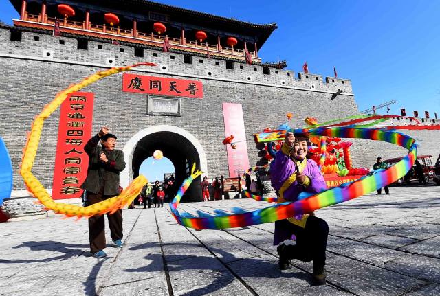 ↑1月30日,市民在辽宁省朝阳市双塔区首届传统文化庙会上表演节目。新华社发(仇一军 摄)