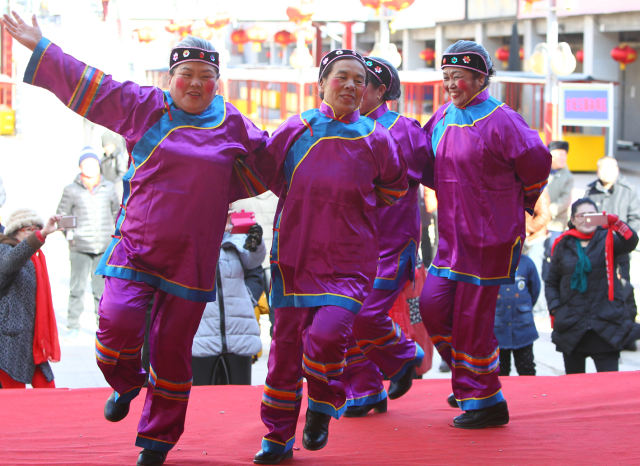 ↑1月30日,市民在辽宁省朝阳市双塔区首届传统文化庙会上表演节目。新华社发(仇一军 摄)
