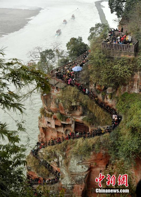 游客排队下栈道。 中新社记者 刘忠俊 摄