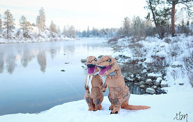 据英国《每日邮报》近日报道,近日,两位美国摄影师在华盛顿州斯波坎谷的一座公园拍摄了一组逗趣、温馨又感人的照片:一对假扮的夫妇穿着外形为霸王龙的服装,摆出各种亲昵的造型,场面十分有趣。
