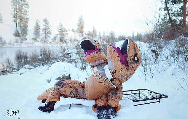 据英国《每日邮报》近日报道,近日,两位美国摄影师在华盛顿州斯波坎谷的一座公园拍摄了一组逗趣、温馨又感人的照片:一对假扮的夫妇穿着外形为霸王龙的服装,摆出各种亲昵的造型,场面十分有趣。