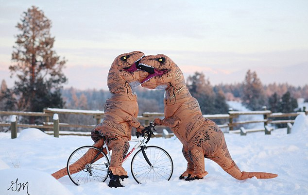 据英国《每日邮报》近日报道,近日,两位美国摄影师在华盛顿州斯波坎谷的一座公园拍摄了一组逗趣、温馨又感人的照片:一对假扮的夫妇穿着外形为霸王龙的服装,摆出各种亲昵的造型,场面十分有趣。