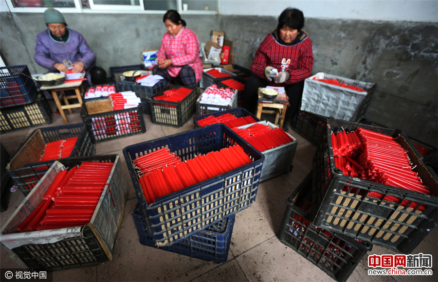 2017年1月11日,西安。西安市户县祖庵镇大庵村,这里的蜡烛远近闻名,多年前这里家家户户都会做蜡烛,好多以做蜡烛为生,也有很多靠做蜡烛发了财,由于现在电子时代的发展,蜡烛的销量远不如以前,这个村子现在维持下来做蜡烛的只有十来户人家,张亚飞和张亚兵兄弟俩就是其中一家做的比较好的。入秋以来是做蜡烛的旺季,一是腊月里喜事比较多,还有就是过年期间农村需求量还是比较大。